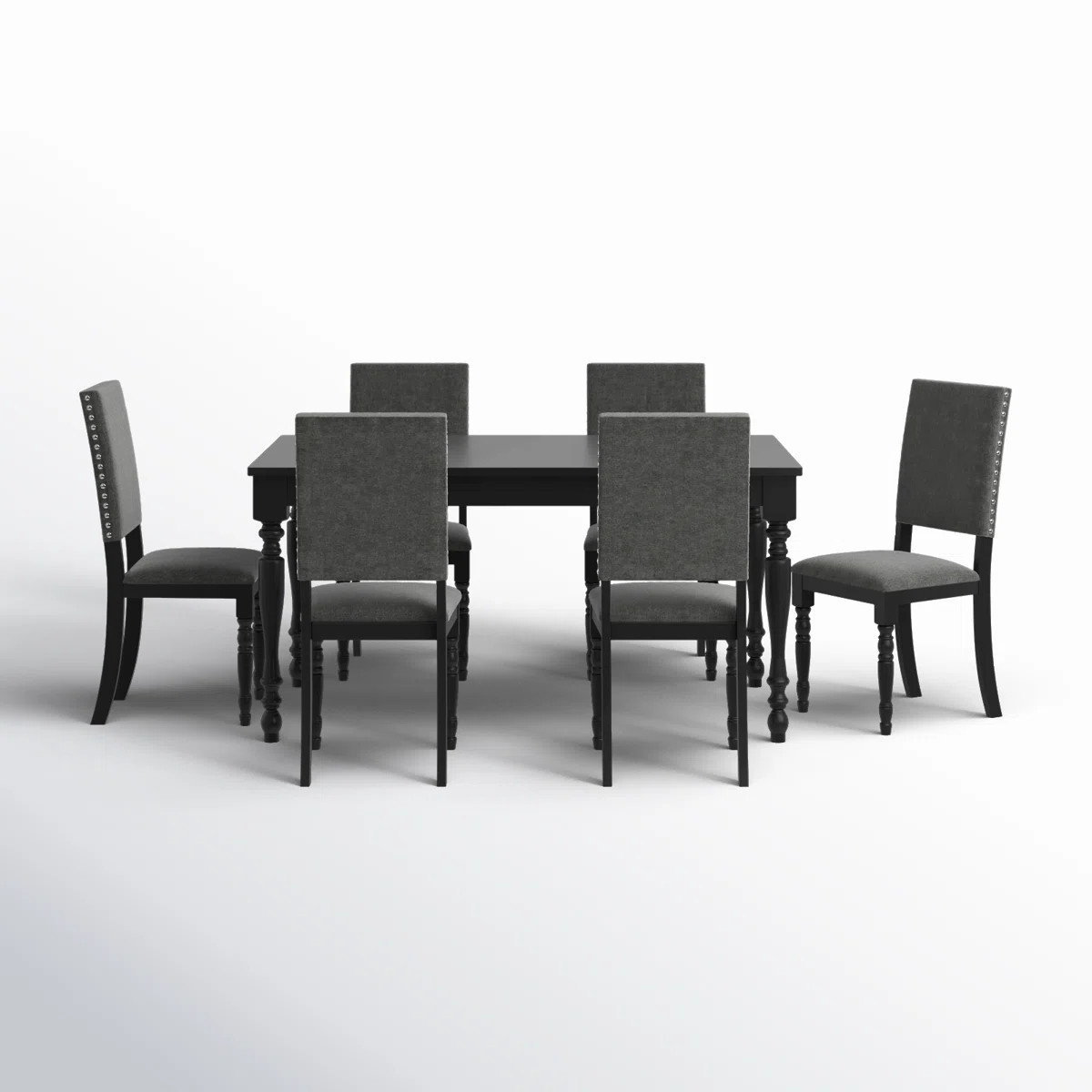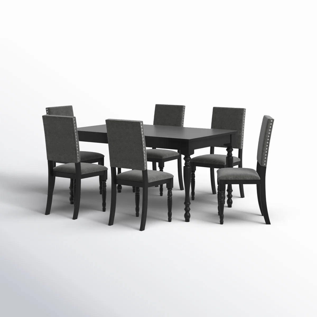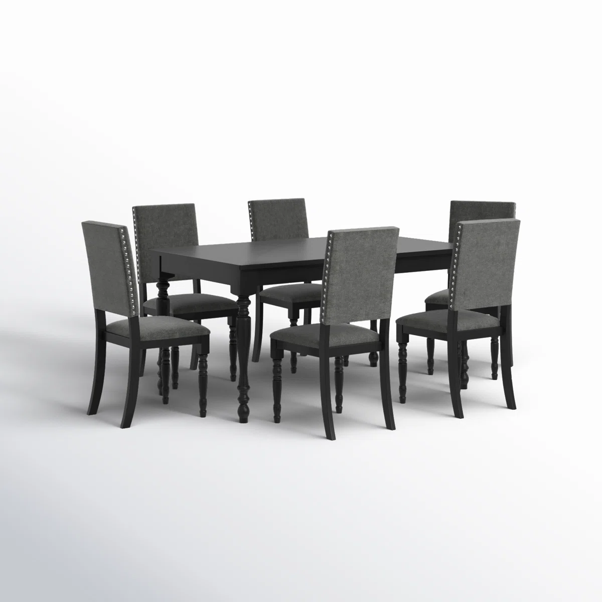This 6-piece dining set brings elegance and clean styling to your dining room. The set includes a rectangular table crafted from solid and engineered wood, featuring a divided tabletop design that adds a touch of sophistication. Accompanied by six high-back chairs, each with a comfortably padded seat upholstered in warm gray fabric, they offer a cozy dining experience. The chairs also showcase classic nailhead trim for an added touch of refinement. Kiln-dried wood ensures a reliable construction, while the 250 lb. weight capacity of the chairs accommodates family and guests alike.